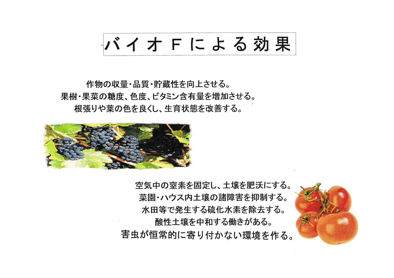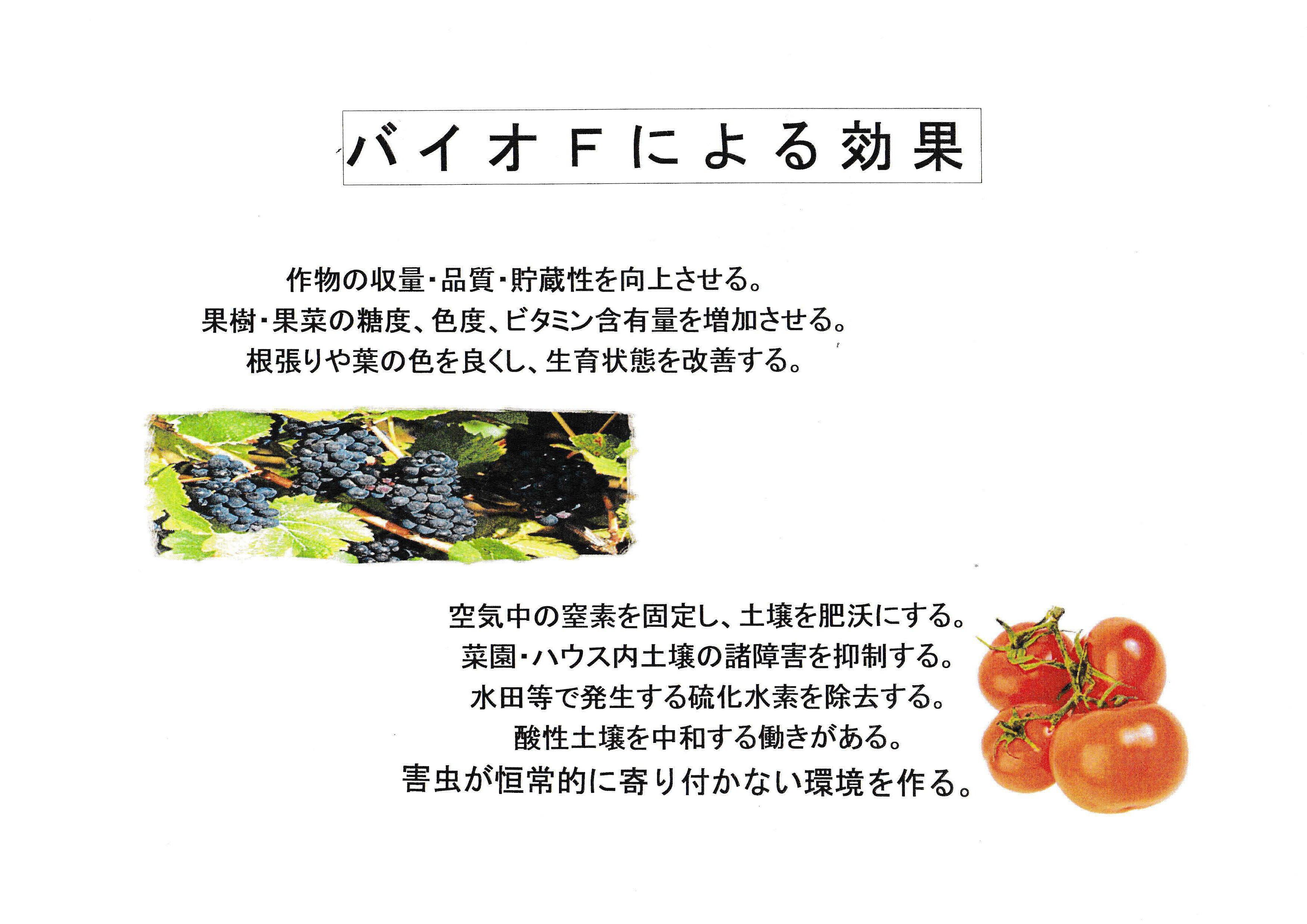 バイオF 使用により作物の収量・品質・貯蔵性を向上させ、他にも以下の効果が確認されています。